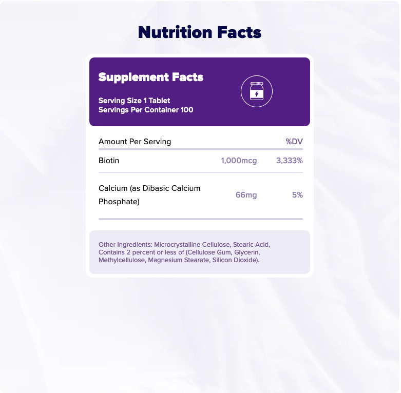 Take 1 tablet daily with a meal. WARNING: Consult a healthcare professional before using this product if you are pregnant, nursing, under the age of 18, are taking medication or have a medical condition; if adverse reactions occur, discontinue use. During use, advise your medical professional that you are taking Biotin before any laboratory tests. KEEP OUT OF REACH OF CHILDREN. STORE IN A COOL, DRY PLACE.