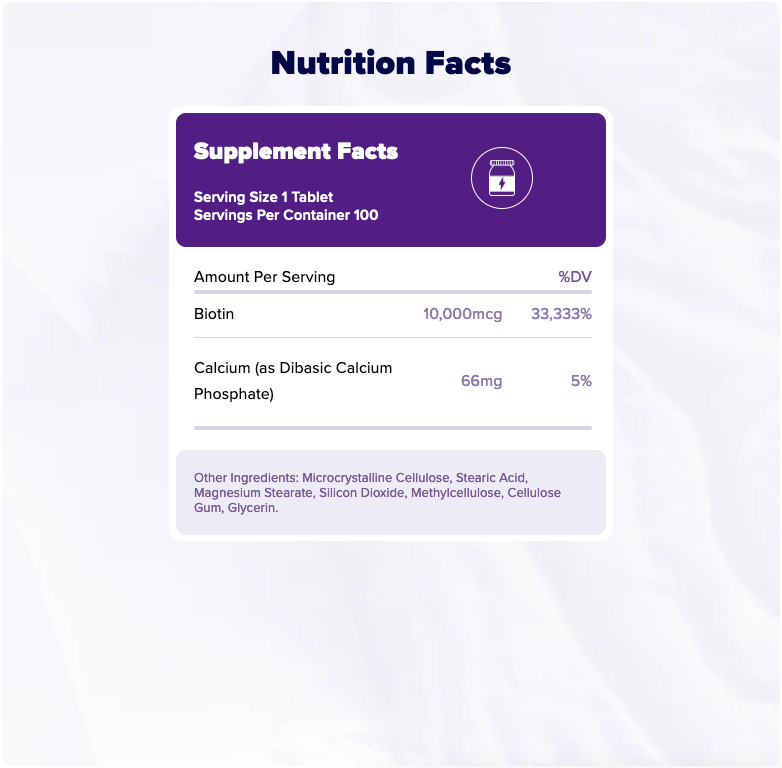 Adults, take 1 tablet daily with a meal. WARNING: Consult a healthcare professional before using this product if you are pregnant, nursing, under the age of 18, are taking medication or have a medical condition; if adverse reactions occur, discontinue use. During use, advise your medical professional that you are taking Biotin before any laboratory tests. KEEP OUT OF REACH OF CHILDREN. STORE IN A COOL, DRY PLACE.