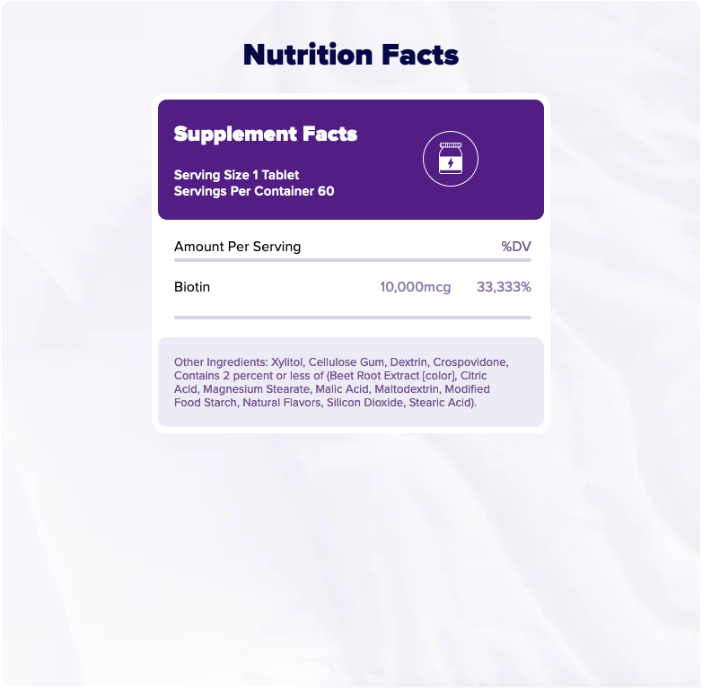 Adults, take 1 tablet daily. Dissolve in mouth or chew before swallowing. No water necessary. WARNING: Consult a healthcare professional before using this product if you are pregnant, nursing, under the age of 18, are taking medication or have a medical condition; if adverse reactions occur, discontinue use. During use, advise your medical professional that you are taking Biotin before any laboratory tests. KEEP OUT OF REACH OF CHILDREN. STORE IN A COOL, DRY PLACE.